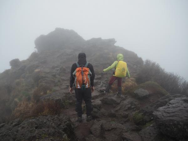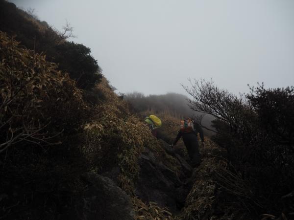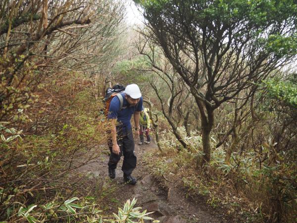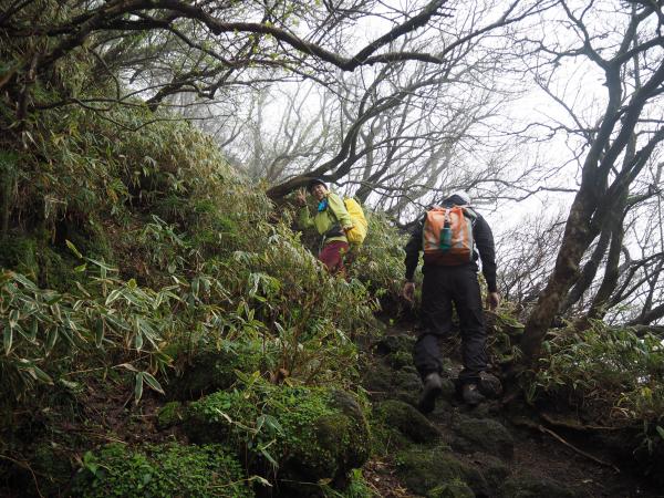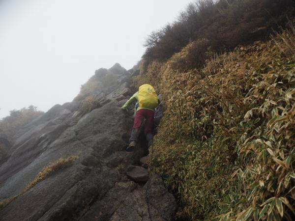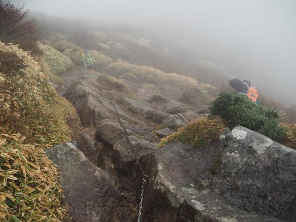 さて、次は国見岳。ゆるやかな尾根道を進み普賢岳への分岐を国見岳方面に向かうと徐々に岩場が増えてきて急な登りに。ロープが設置されているような所もあり注意が必要です。今日は雨なのでより慎重に。