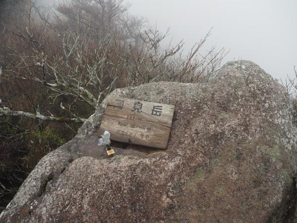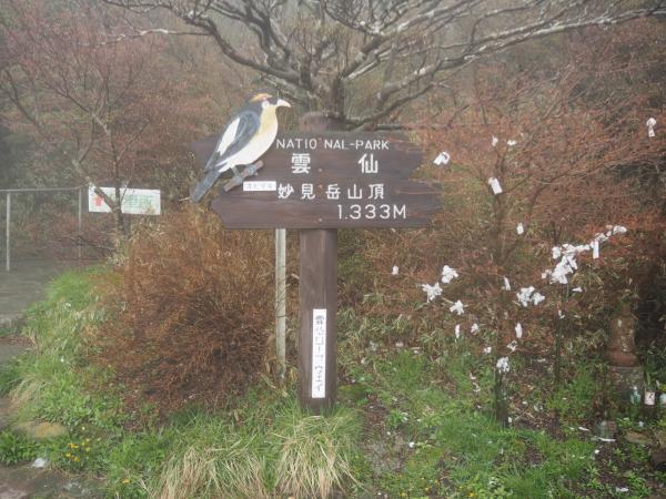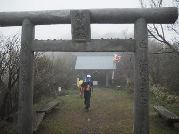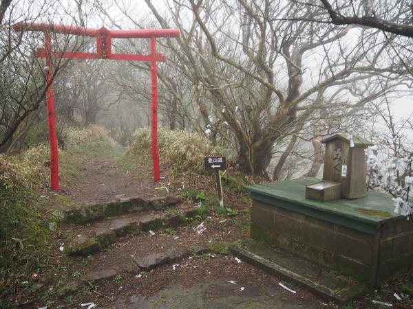 妙見岳へもひたすら登りが続きます。雨で濡れた登山道を注意しながら30分。妙見岳?に到着。ここはロープーウェイの駅。一応そこに看板があったのでパシャリ。少し登ると展望台があります。もちろん何も見えませんが、、、そこには小さな鳥居と祠も。あとでわかったのですがその祠の裏手に本当の妙見岳ピークがありました。失敗、、、