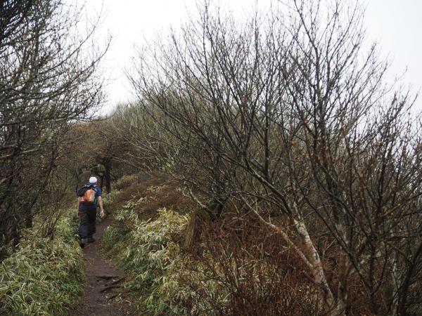パッと開けたところが山頂。もちろん眺めなし。風が通り寒いのでそそくさ撤退。ところで、今日は雨のち曇りの予報。スタート時点ですでに雨はあがってきていたので上着はレインウェア、下はパンツとゲイタースタイルで歩いていました。が、この国見岳への登りの登山道は細く雨で濡れた笹が茂っておりなんとパンツがびしょびっしょに!!雨ではなく濡れた笹に泣かされました。というか、履けよレインパンツですね。