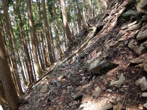 石、岩、木の根、枯葉などが整備されることなく広がっているため滑落に注意。