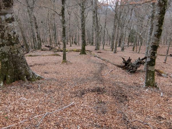 中部の1196m付近は斜度が緩み走れますが、広い尾根で踏み跡が明瞭ではありません。