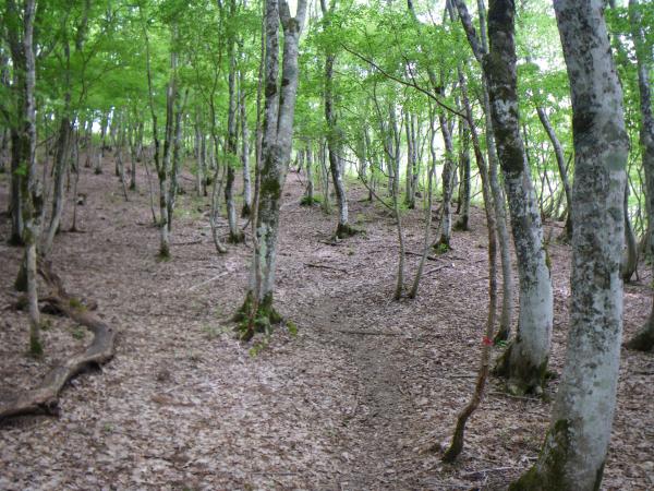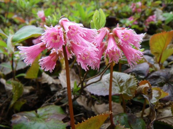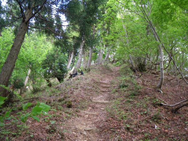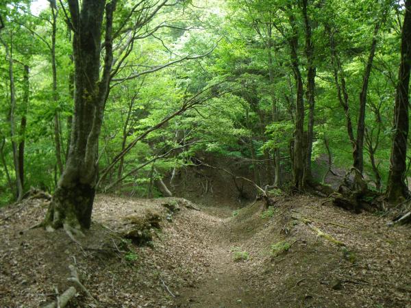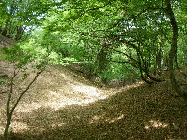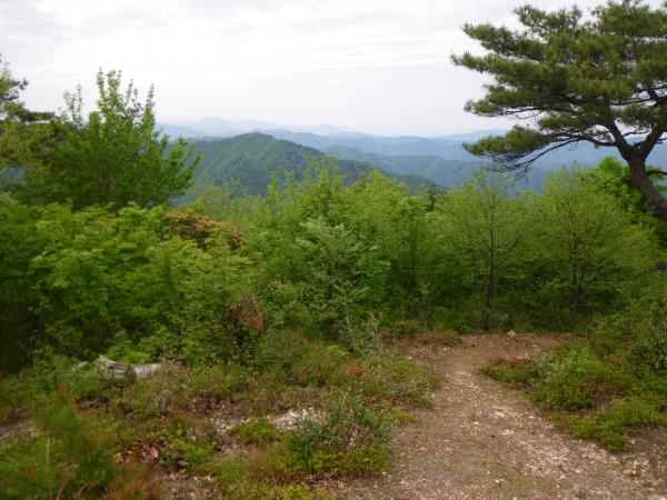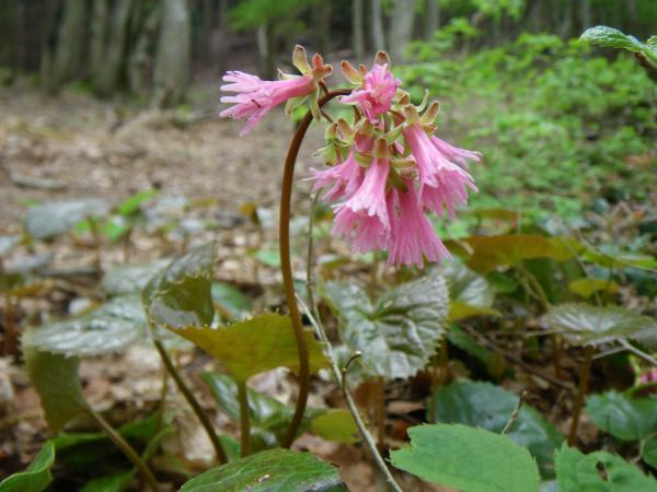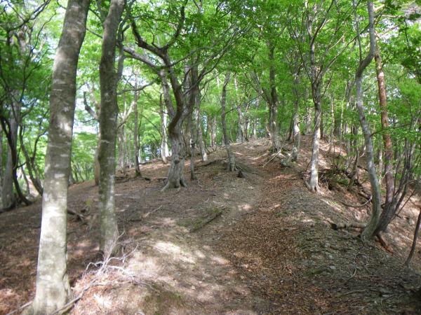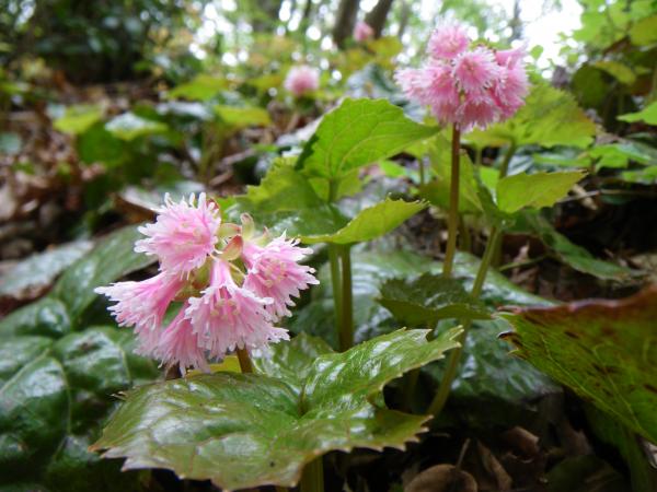 五波峠からのコースは単調な尾根沿いで、この時期は新緑のブナ林を味あうコースになっていて、山頂付近でイワカガミの群生が見られます。こちらは見頃~終わりの感じでした。京都側からくると美山を通過しますので、かやぶき集落に寄られたらいかがでしょうか。