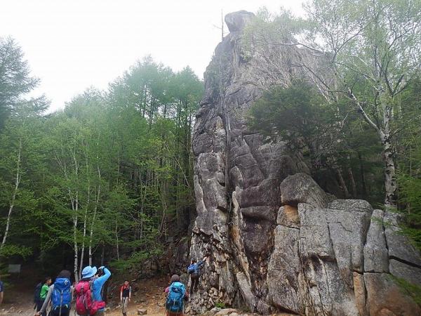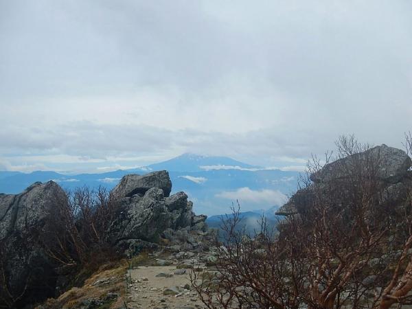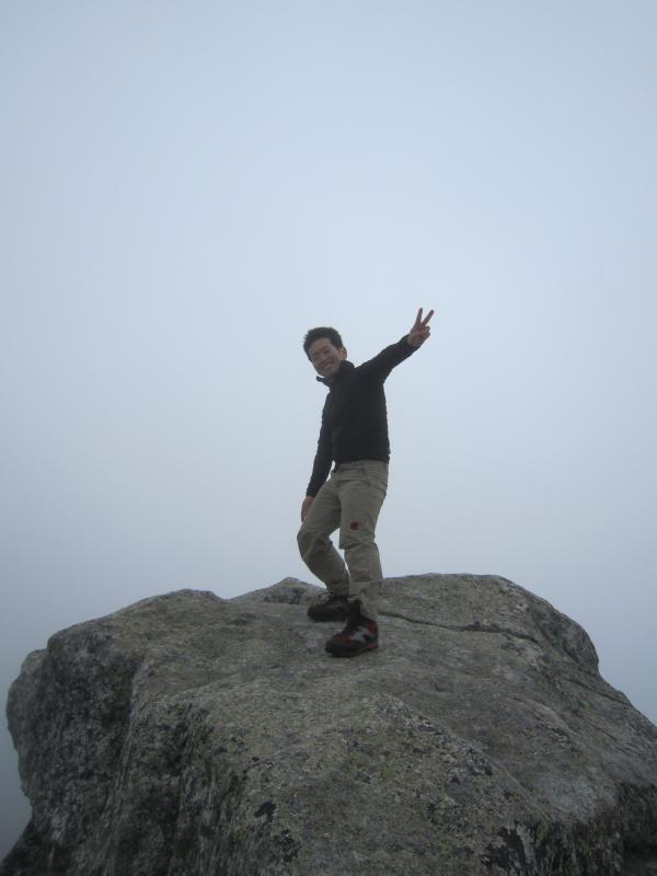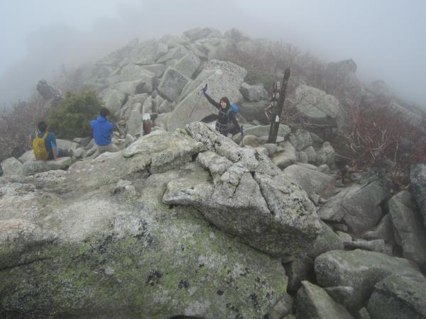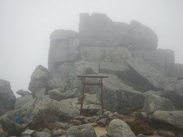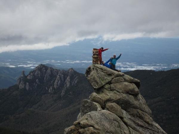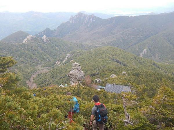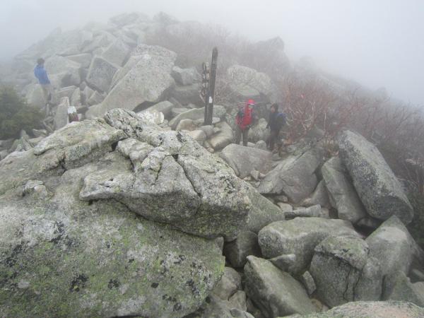 ごつごつした岩場を超えて、山頂へ。向かい側の五丈岩に誰か立っています。