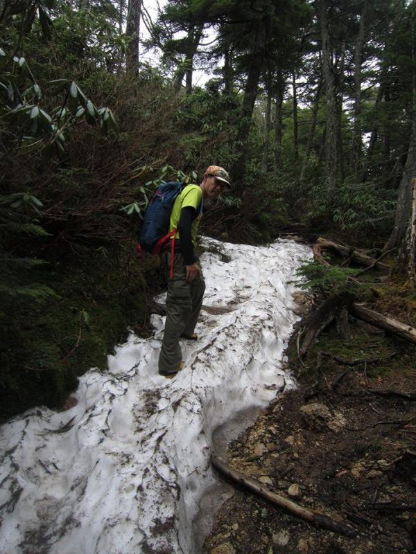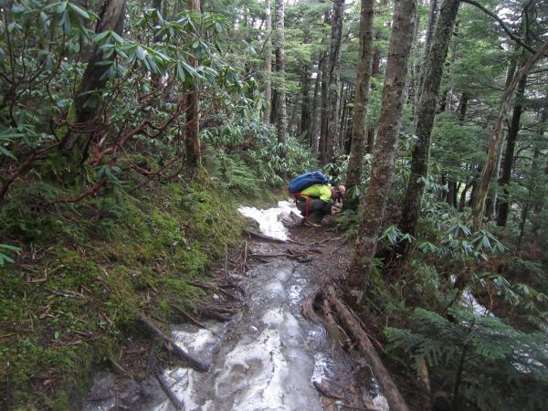 - 金峰山小屋手前から残雪あり。フロストして凍ってる部分あり。