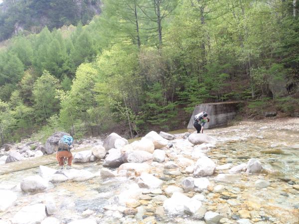 - ゲートを越えてすぐ左へ曲がって西股沢を渡渉します。渡渉してから、踏み跡を見逃さないようにひたすら山を登ります。特にわかりにくさはないですが、やや急登なのでしっかりとアプローチシューズで登ることをお勧めします。