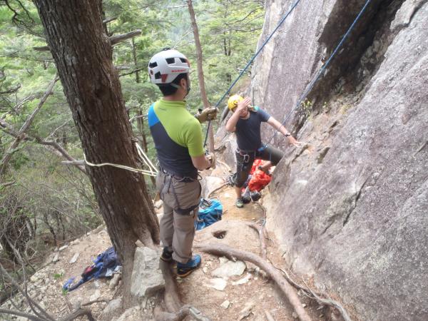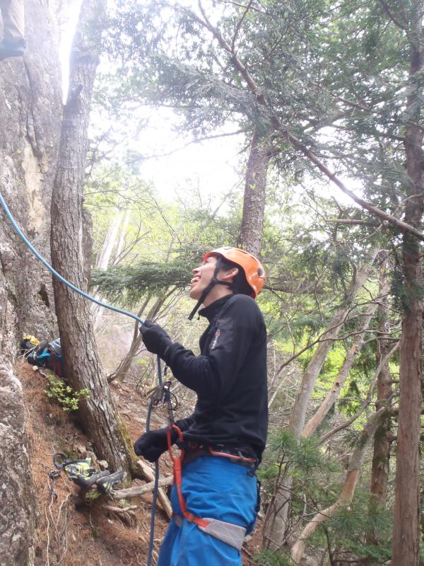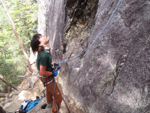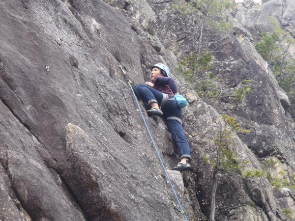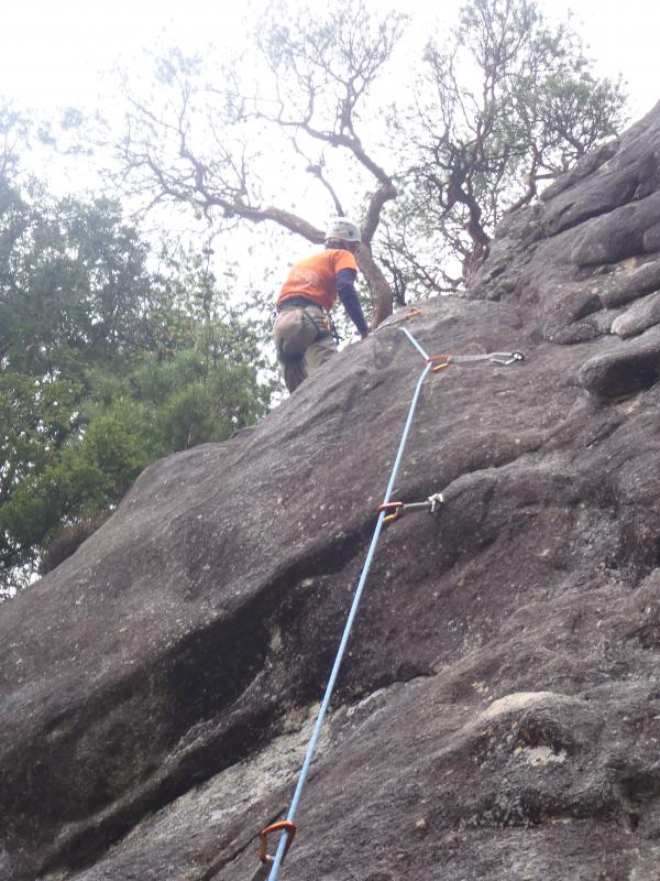 こちらもリードでチャレンジ。やや右寄りだと登りやすい。私は4Bまでは直下で登ったが、5B目は怖くて右に避けました。右に避けると最後の支点をとる距離が出来てしまい、一度セルフをとってから最後の支点に取りつきました。