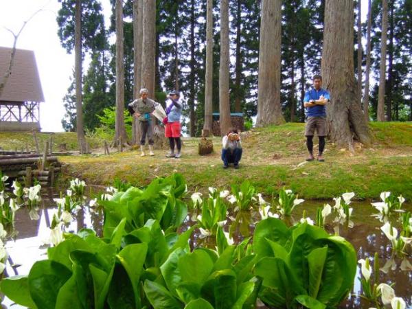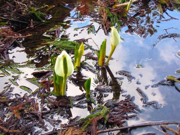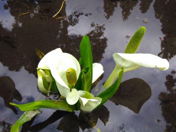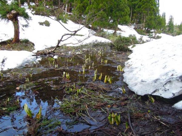 初めて見た水芭蕉は、雪解け間近の山の中で白い花がぽつりぽつりと優雅に咲いていました。