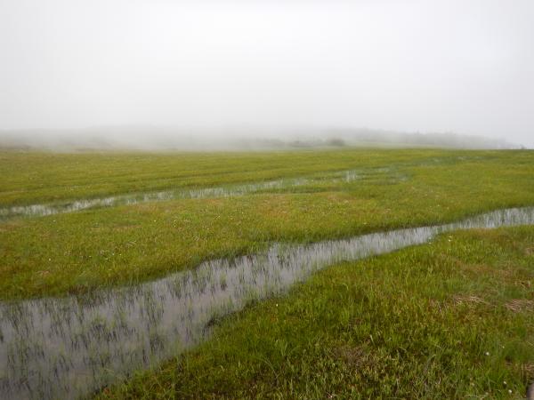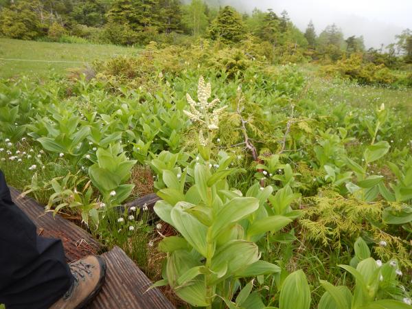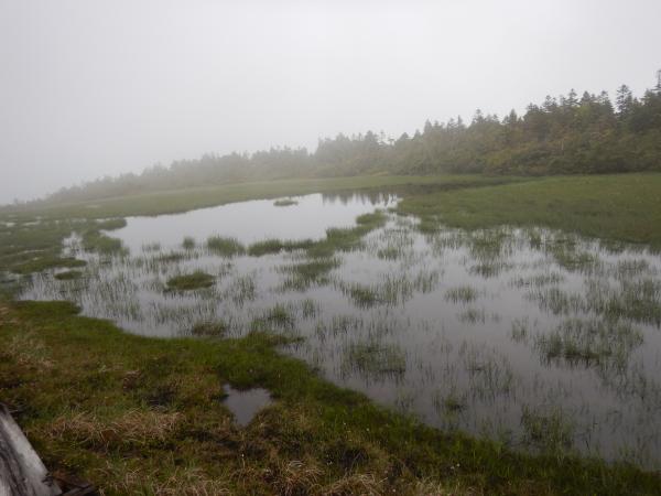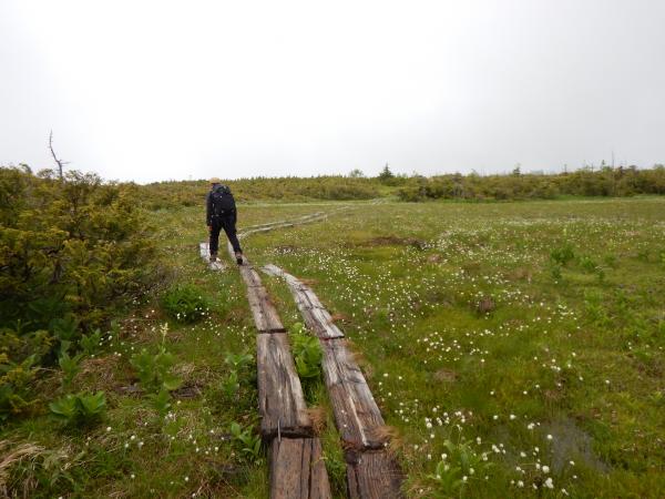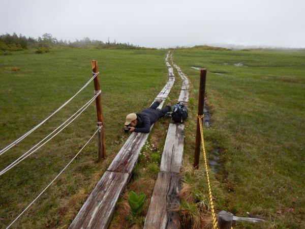田代山の山頂付近は平らで、一面湿原が開けています。そして尾瀬のように木道歩きでの探索。池塘があり、いろいろな種類の花が咲き乱れ…