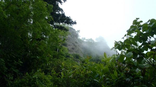 ガスの切れ間にちょっとだけ特徴的な形の頂上が見えました