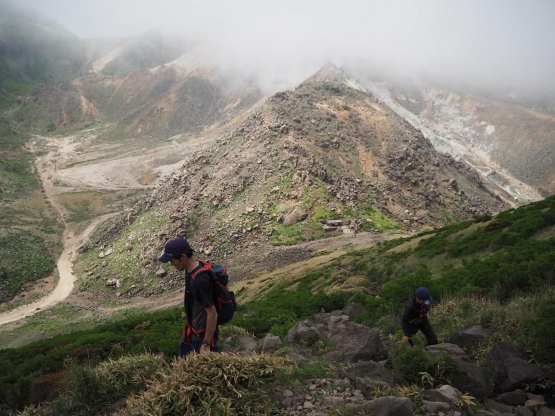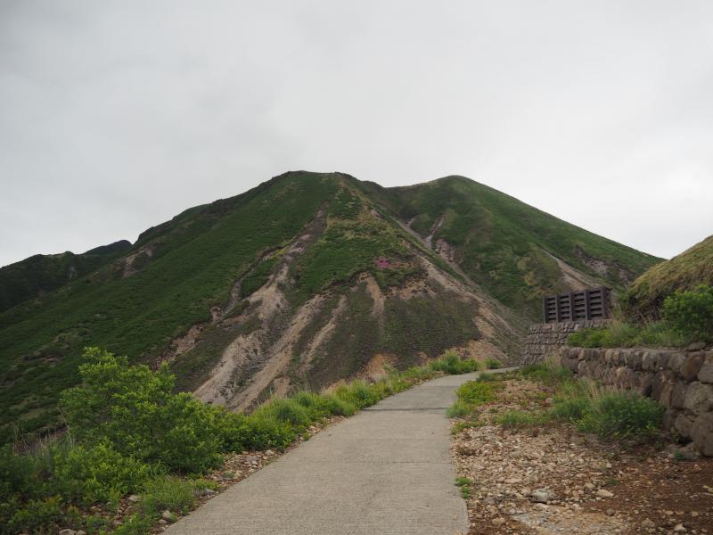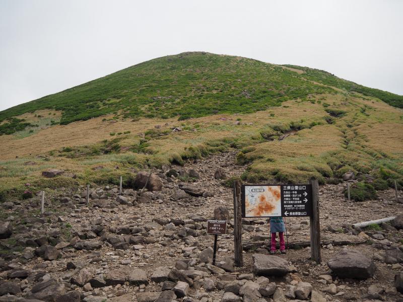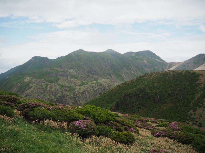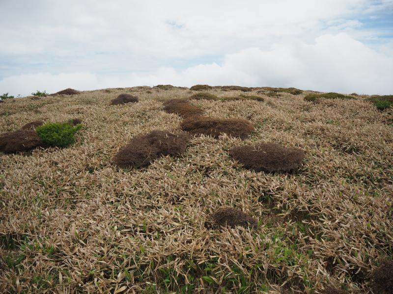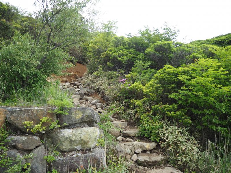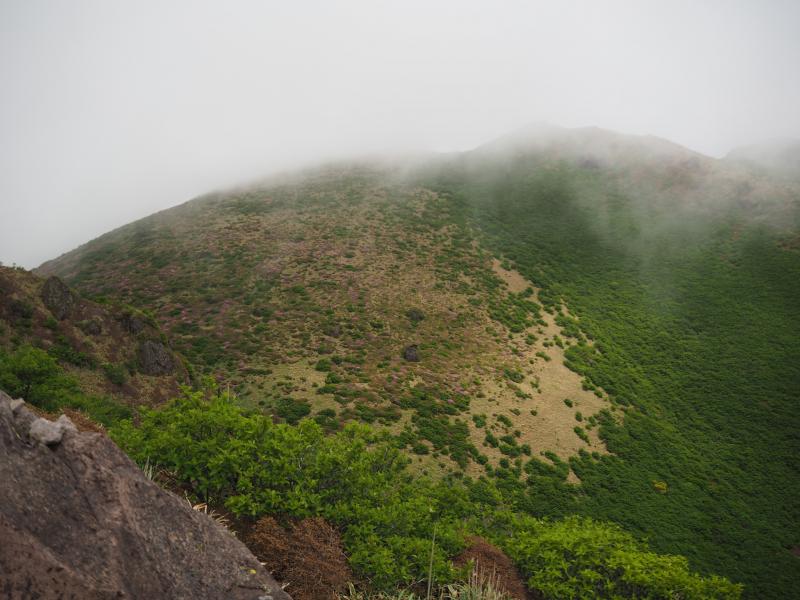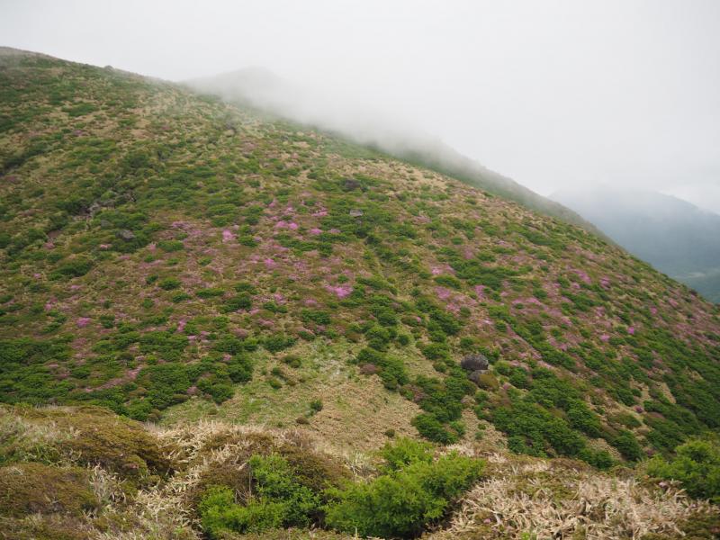 林道にでたあたりから三俣山の斜面にチラホラとミヤマキリシマが視界に入る。諏蛾守小屋に荷物をデポし三俣山に登る。この時点でより空模様が怪しくなるが、それよりもミヤマキリシマがほとんど見ることができない方が問題だった。確かに咲いてはいるが一株に点々と申し訳ない程度に咲いている。時期が遅くすでに枯れてしまっているのか。いやそれにしても少ない気がする。