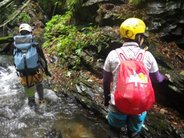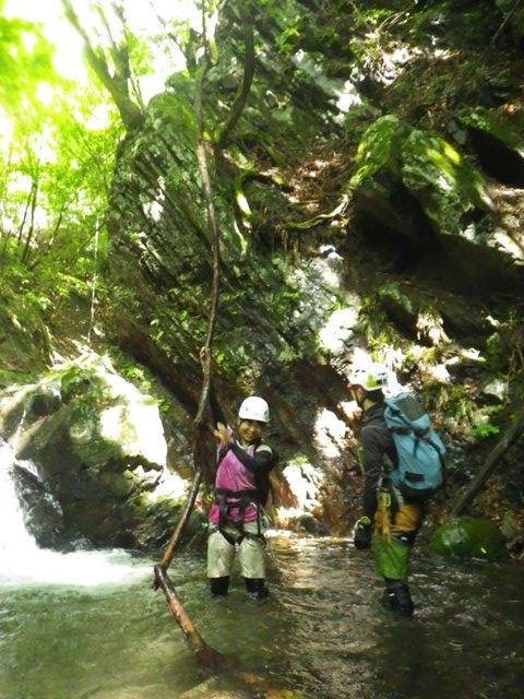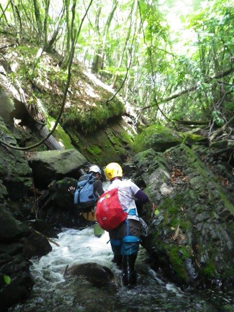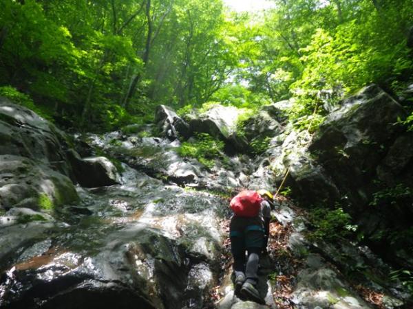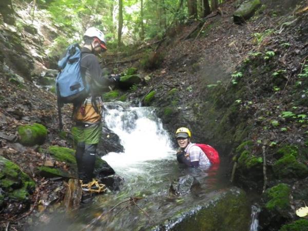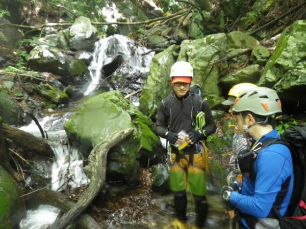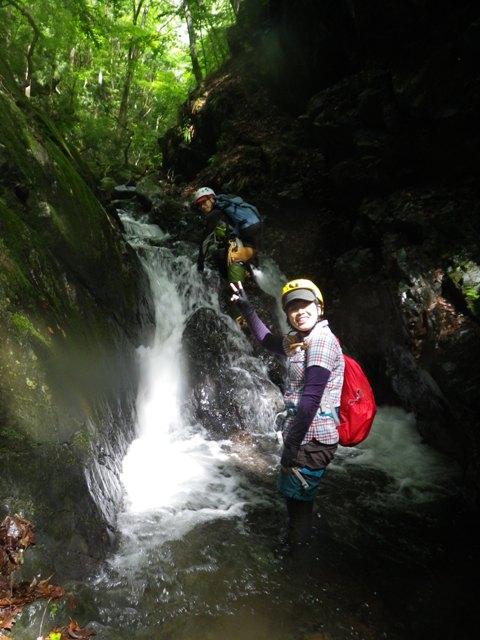 今回のリーダーは磯部さん、それに沢登り経験者の小澤さんにフォローしていただき、いくつかの小滝を詰めていく。