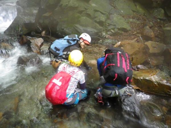 直登が難しい滝を高巻する時に、大きな落石が!リーダーの磯部さんのおかげで、幸いメンバーに大きな怪我もなかったけれど、初心者2人は口があんぐり。「こ、怖かったー!!!」
