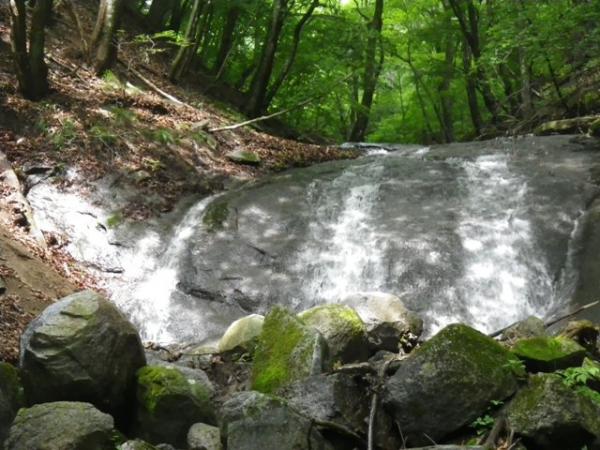 - 道証地蔵の登山口直下の大鹿川より入渓→(210分)→12mの大滝→(30分)→ナメ沢→(10分)→右岸の登山道に合流→90分→道証地蔵