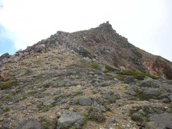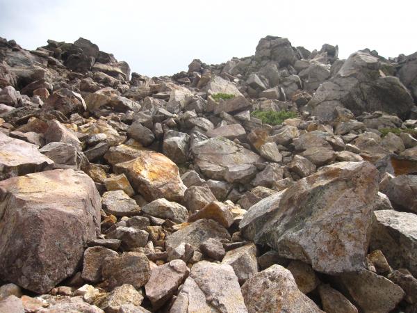 剣ヶ峰は大小の石が積み重なったところを登ります。浮石も多々ありましたので、一歩一歩慎重に。