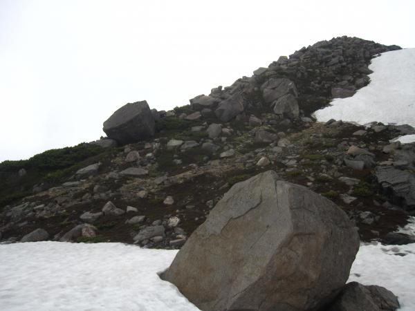 スタートは砂防新道コース。久々の雪渓は、キックステップとストックで何とか乗り切りました。
