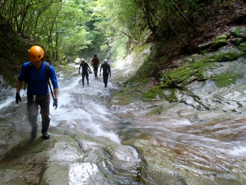 ナメ床が続き、危険な箇所もないので楽しみながらの遡行です。