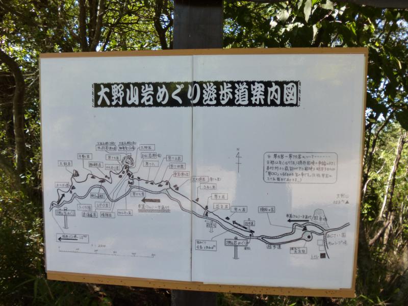 - 大野山山頂駐車場(10分)大野山岩巡り遊歩道(30分)柏原バス停(15分)西畑の集落(10分)柏原バス停(10分)大野山アルプスランド登り車道(30分)猪名川天文台(3分)大野山山頂(3分)大野山山頂駐車場