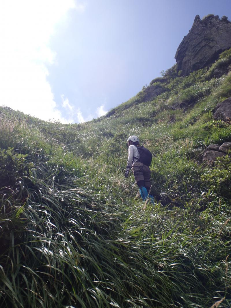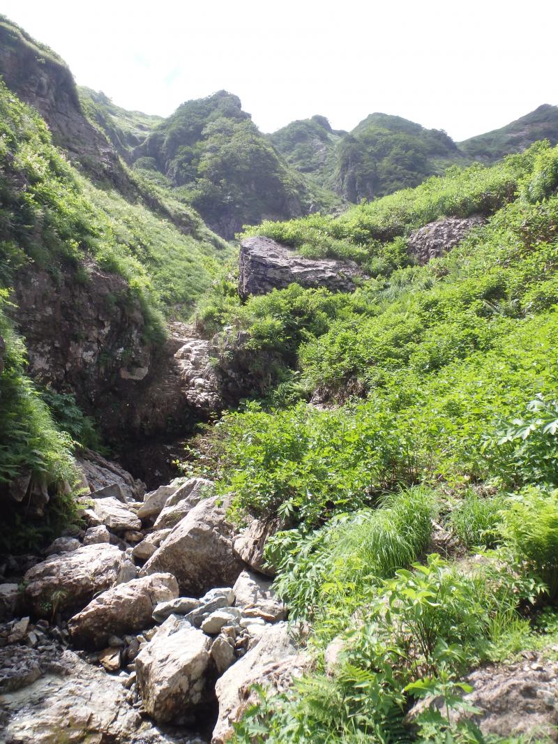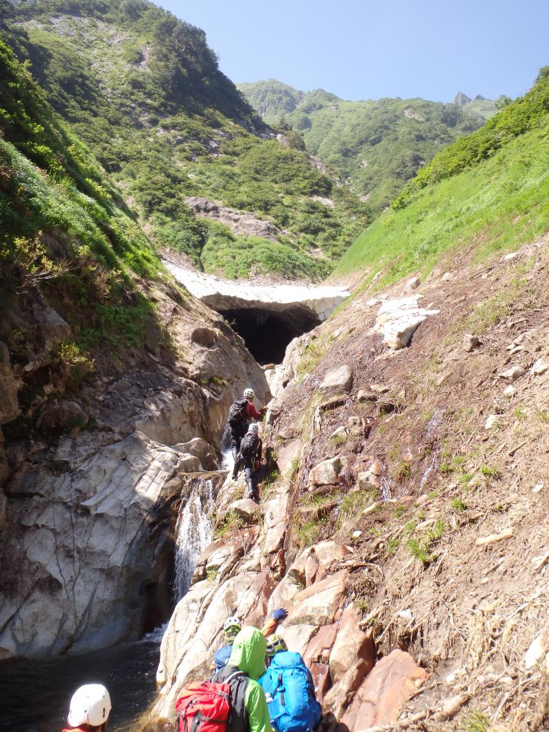 - 万太郎谷本谷下部は快適な遡行が楽しめたが、井戸小屋沢に入って、2ヶ所スノーブリッジが残っており、高巻きや滑りやすい草付き等の通過を強いられた。