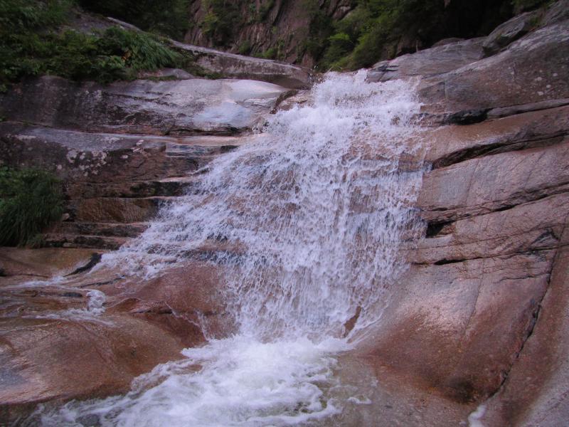 この滝はスラブを流れた水が空中にねじれて飛び上がる珍しいものですが、この日は水量が少なめなのか、やや迫力に欠ける感じ。それでも滝そのものは巨象の背を思わせる雄大なスケールで、ナメ滝群の造形は大変美しいものでした。