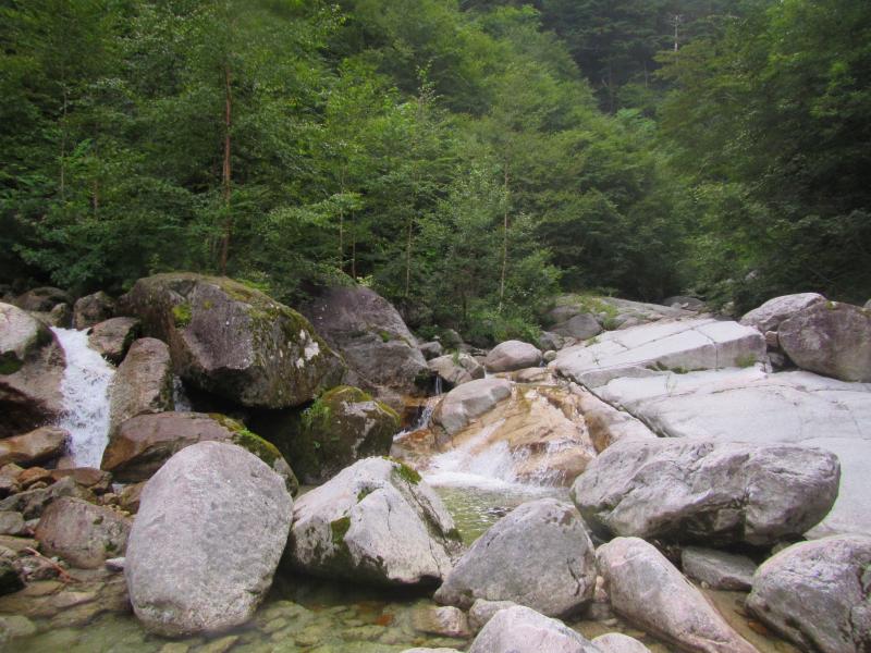 ここから入渓点までは急下降。踏み跡はとても明瞭で、固定ロープがあるので、それを利用しグングンと高度を下げます。入渓点となる小さな河原は明るく穏やかな渓相。甲斐駒の奥深い懐に入ったことで、否が応でもテンションが上がります。