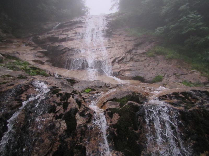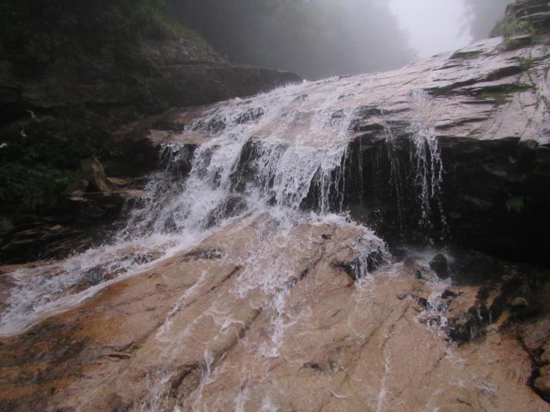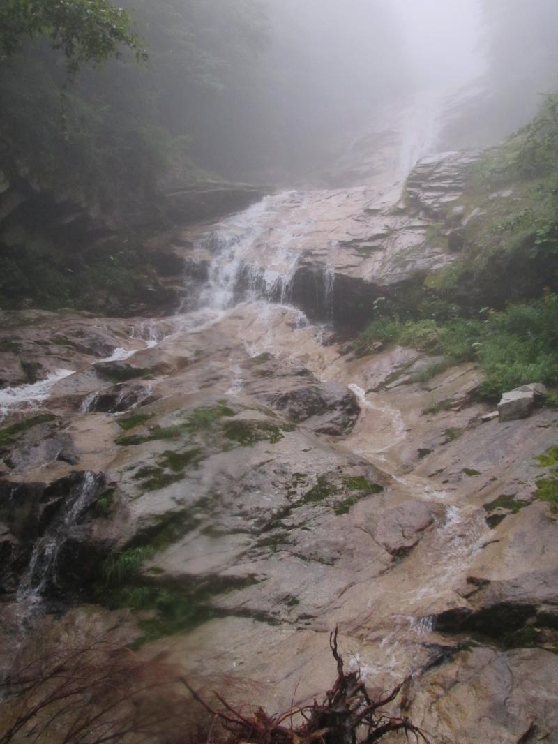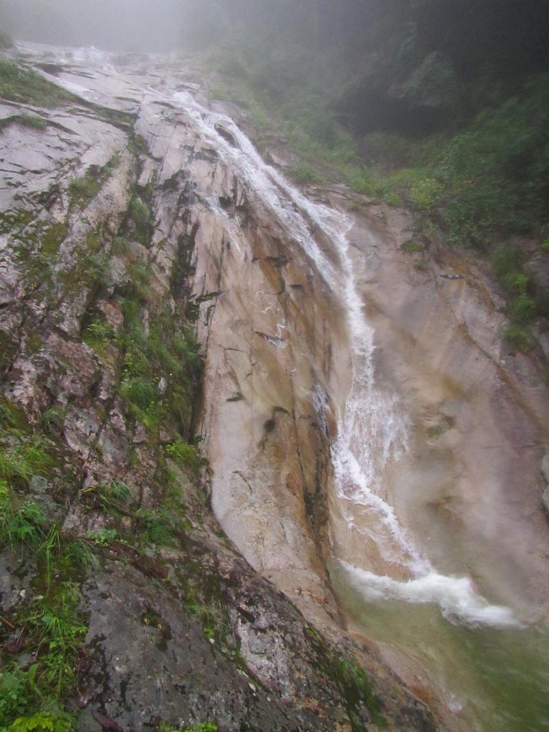 そしていきなりガスのなかから忽然と姿を現す千丈滝の雄姿。下から全てを見通せない見事な4段滝です。2段目までは何とか登れますが、3段目と4段目は全く手が出ません。右岸の巻きが容易なので、レベルに応じて安全に登りたいところです。