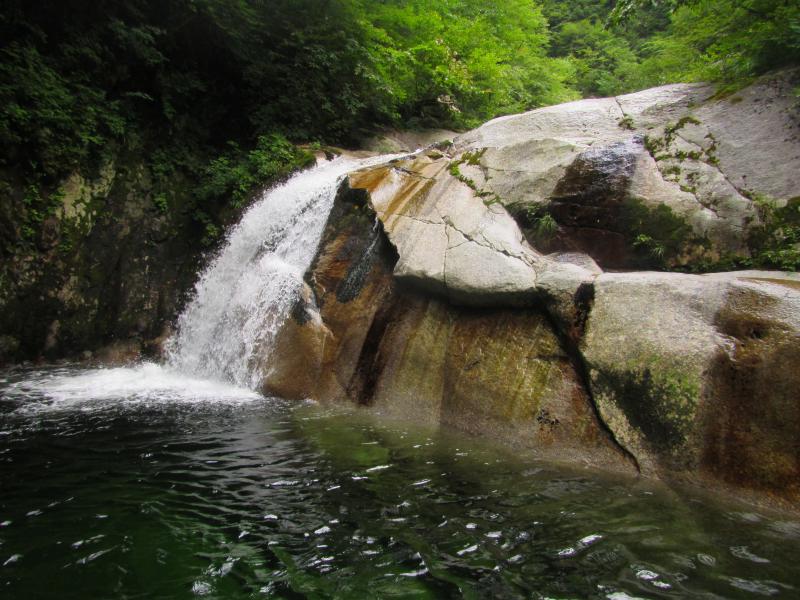 水量が一気に半減した黄蓮谷に入ります。冷たい水に浸かりながら僅かに進むと、いきなり登れない4m滝。大釜左端のルンゼを固定トラロープで直上した後、足場の悪いスラブをトラバースしますが、朝一番のムーブとしてはきついものがあります。その先は滝らしい滝もなく、奥秩父のような苔むした渓相が続き、しばらく淡々と進みます。