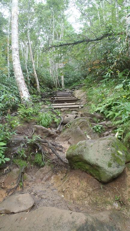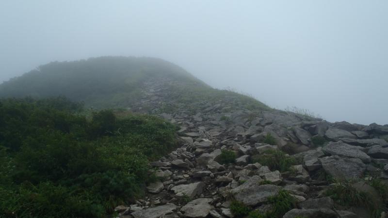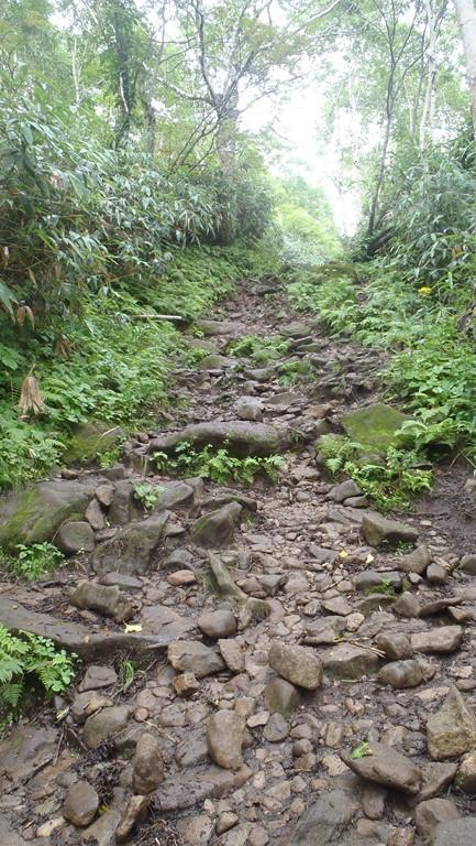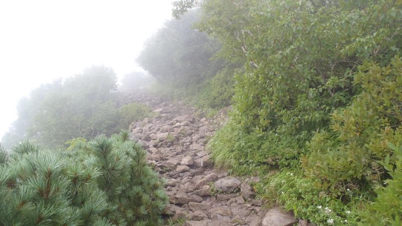 - 前半は樹林の中の広い登山道で歩きやすい。後半からはガレ場も多く、樹林帯を抜けるので晴れれば展望が良いが、今回はガスで見えず。風が強い時は防寒対策をしっかりと。短いコースですが、登山道は岩がゴロゴロしているのでソールがしっかりした靴の方が歩きやすいと思います。