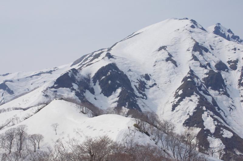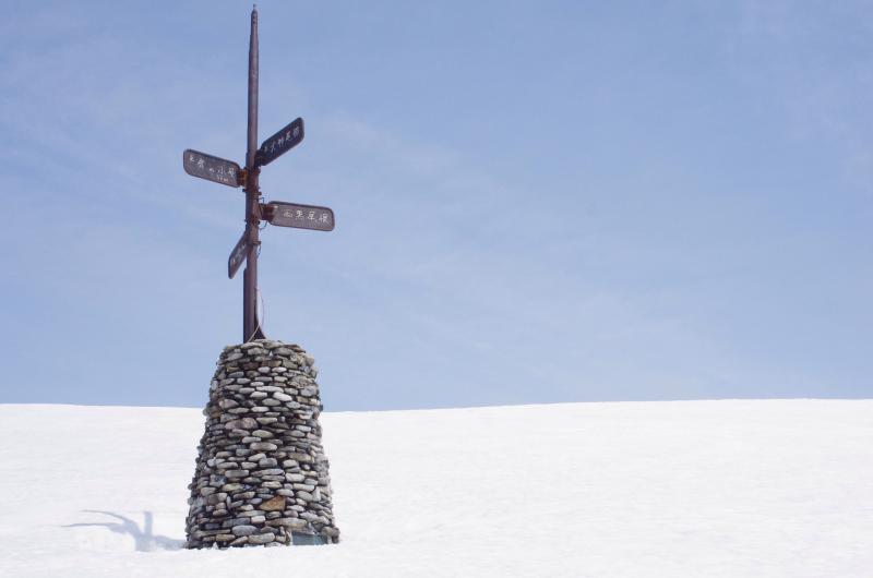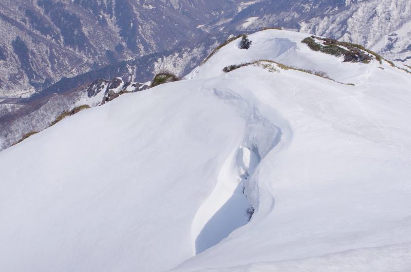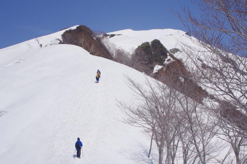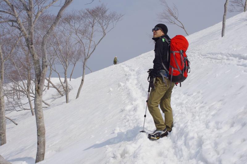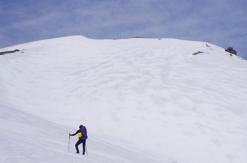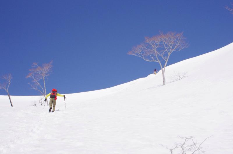 ■肩ノ小屋手前の斜面は見た目より斜度があります。この日は表面はウインドクラストしていましたが、歩くと5㎝ほど沈み込む程度。条件次第では凍結に注意が必要です。