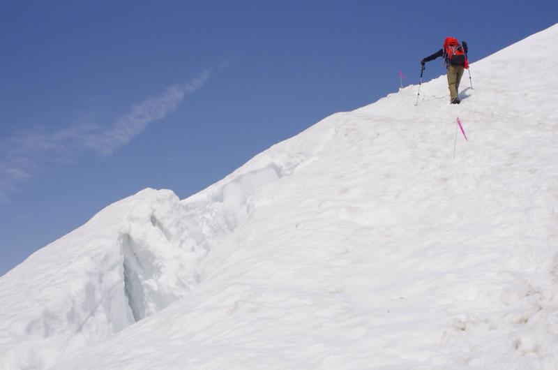 今回のコースは大きな危険個所はありませんでしたが、途中の鎖場や斜面のトラバースでは滑落に注意して通過をします。また、トラバース道のトレース上で雪面の下に空洞が出来ており踏み抜く様な箇所がありますので、踏み跡の様子をよく見ながら足運びには注意をしつつ歩行しましょう。