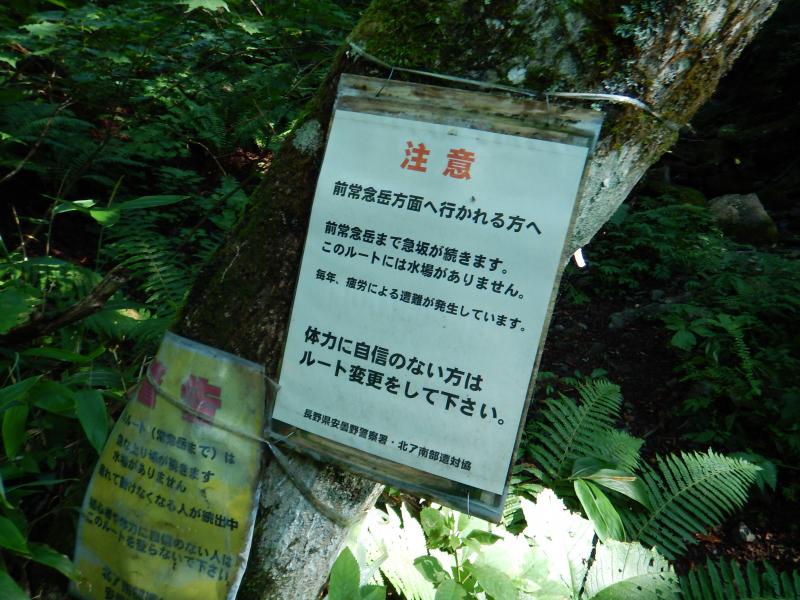 三股付近には「急坂、水場なし、体力に自信のない方はルート変更をしてください!」の注意看板がちらほら。テント泊装備を背負っての登りはたしかになかなかのものでした。