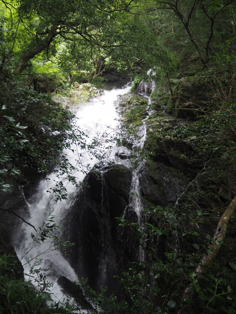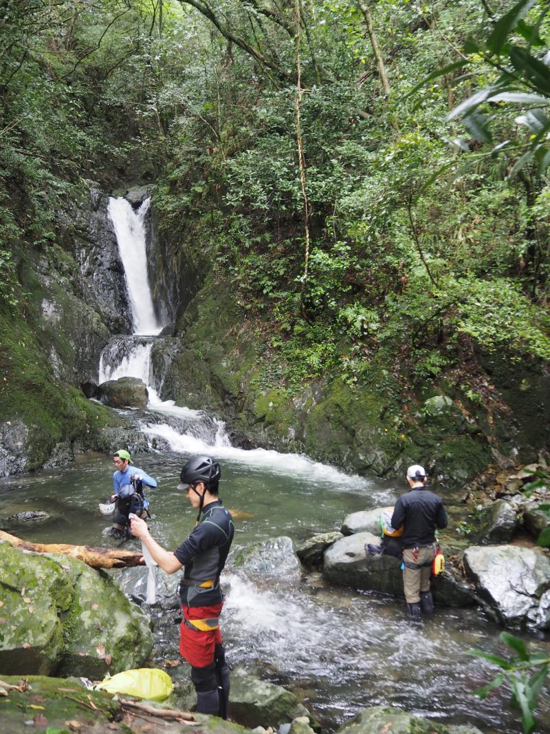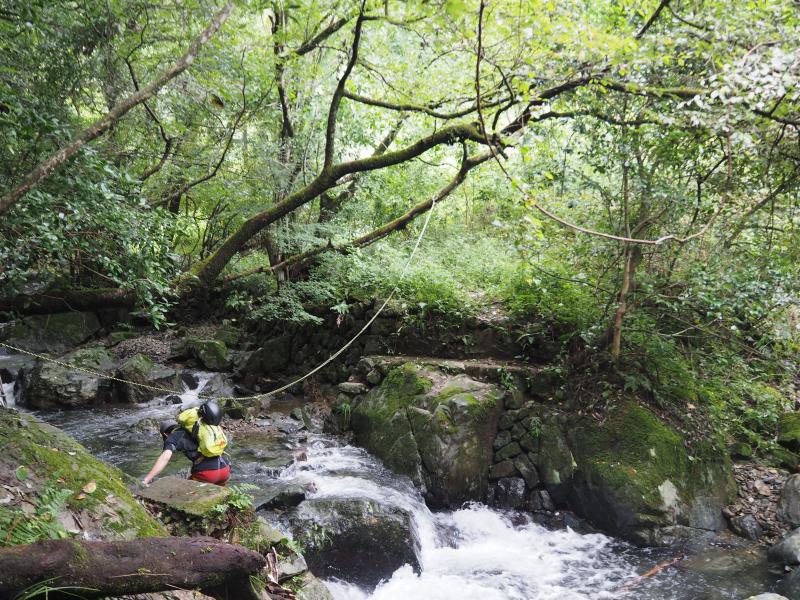 先日の台風の影響か葉や折れ枝が道を埋めていました。台風の強さを物語っています。最初に出会う登山口ではなくもう一つ先の七重の滝コースの登山口へ。沢沿いをしばらく進むと沢を徒渉するのですがこれが渡れない!!水量が多くて流れも速くて、、、ロープが渡してあるのですが無理無理。が、沢登チームは沢靴なのでどぼどぼ川に入っていきます。ずるい。皆様に支えてもらってなんとか渡りました。まず1個目の核心(核心て何個もあっていいのか?)