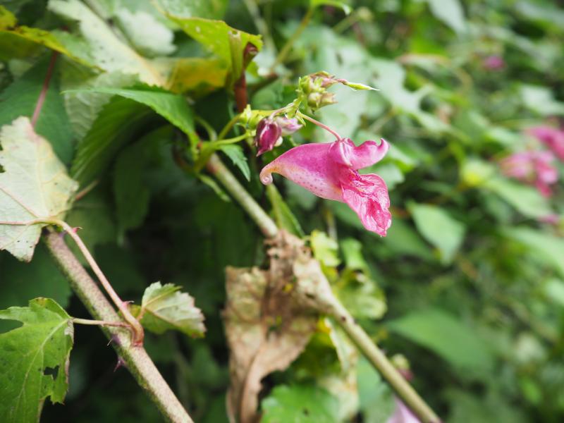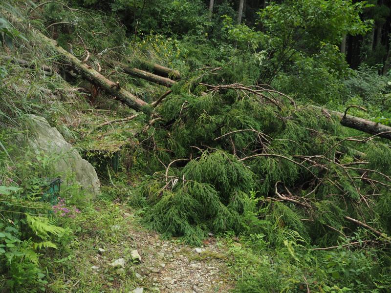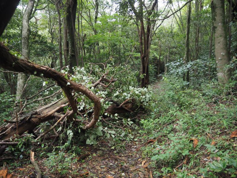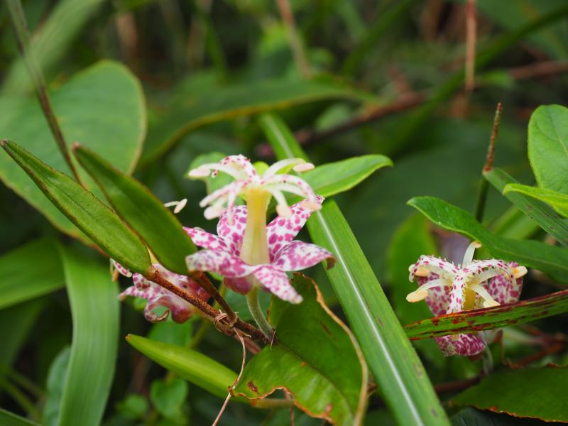 風も強いのでそそくさと下山開始。ケヤキ谷コースを進みます。降りはじめてすぐヤマホトトギスがたくさん咲いていました。すごいすごいと写真を撮るのに気を取られ滑りそうに。そう、下山コースも道は荒れあれ。やはり台風の影響がここにも。慎重に下ります。