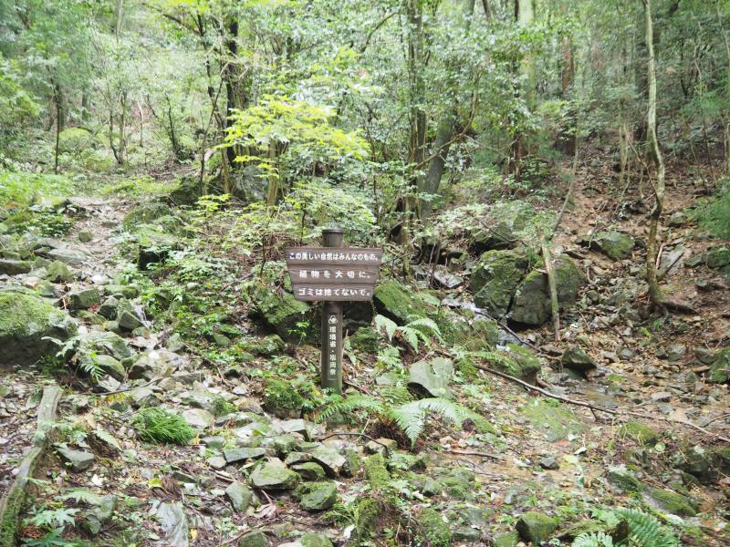 山瀬越の分岐を過ぎてしばらくすると急登になります。ここが本日3回目の核心でした。岩がゴロゴロした足場の悪い道を進んでいくのですがだんだんと赤テープが見当たらなくなり、登山道ではなく沢筋を登ってしまっているんじゃないかと不安にかられあちこちきょろきょろ。でも確かにここのはずだと思い進んでいく。さすがにここは真っ直ぐいけないだろうというところで右になんとなく踏み跡あり。そこを少し登るときれいな登山道にあたりその先には立派な看板が。だったらもう少し手前にも目印が欲しい、、、