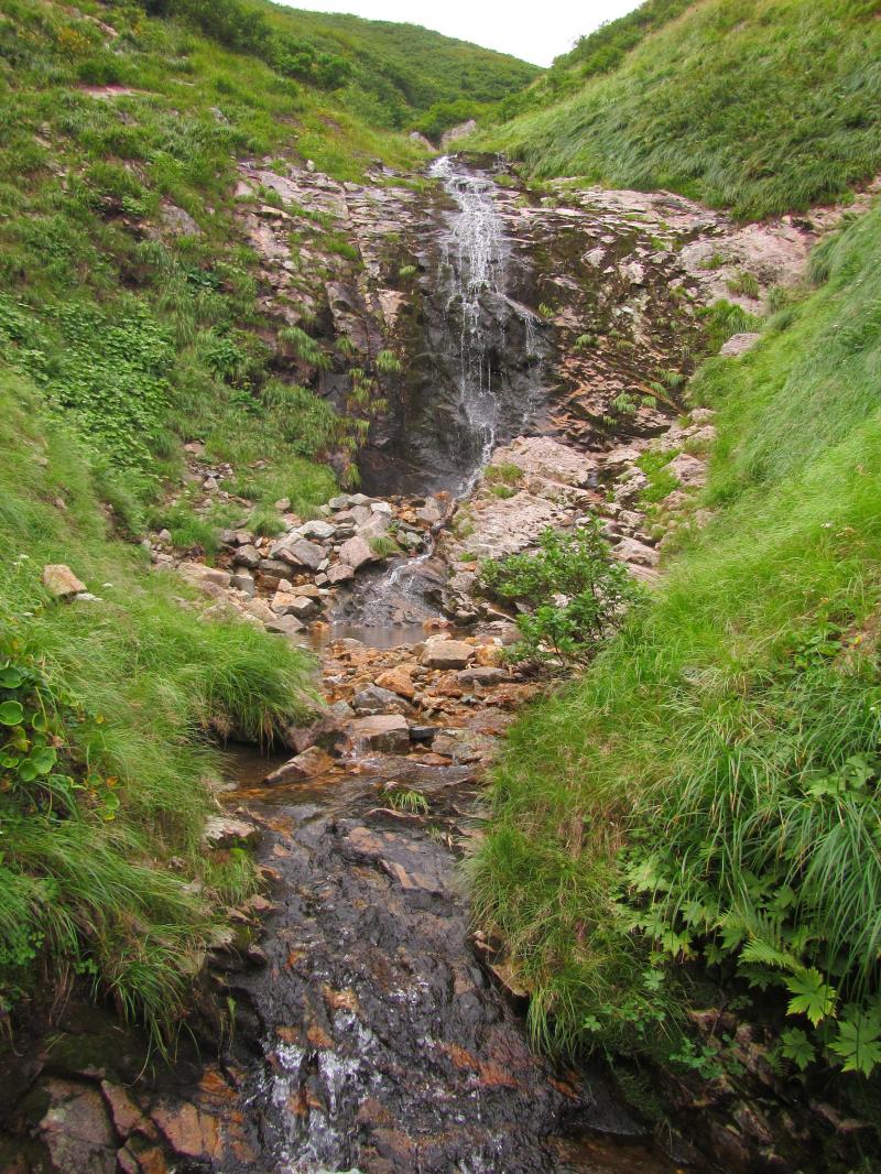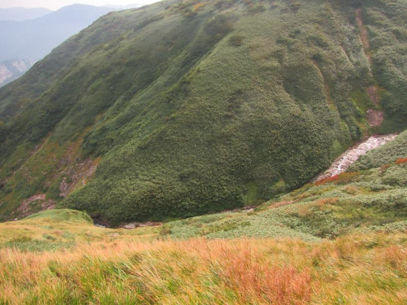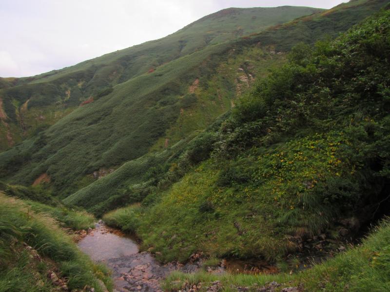 顕著な二俣は右へ。左は段々と傾斜が増し、牛ヶ岳の北側の鞍部に詰め上げている感じですが、今回は右へ右へと小滝を幾つか越えながら本流を辿り、適当なところから傾斜がやや緩く登りやすい斜面に取り付きます。そこからは藪漕ぎもなく、気分爽快な草原の詰め。振り返ると、巻機山斜面の緑の美しさに目を奪われます。