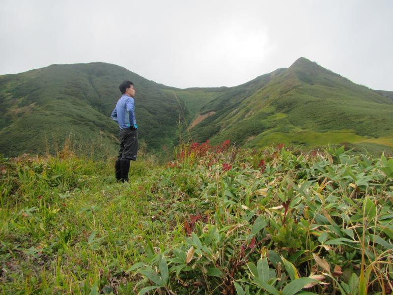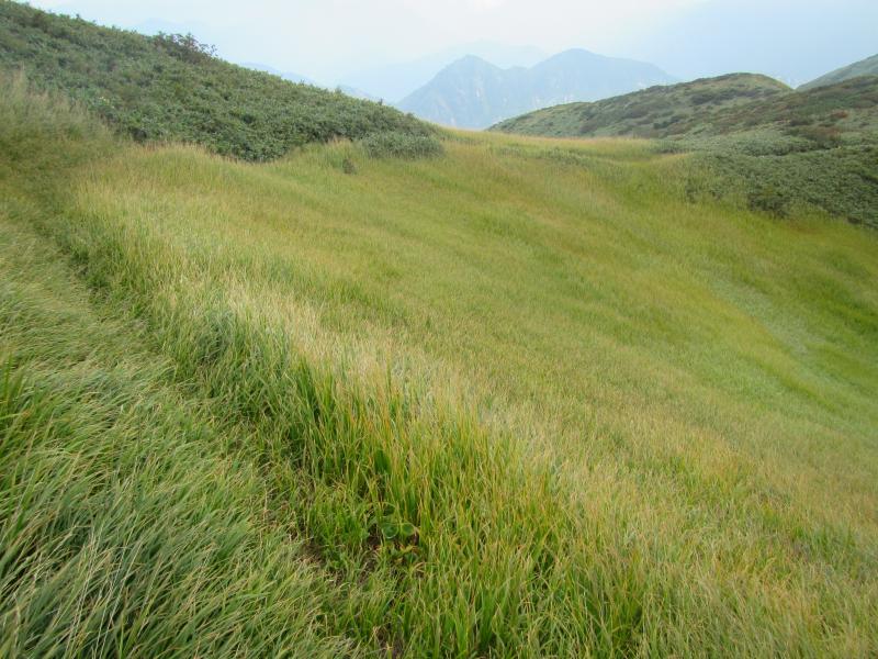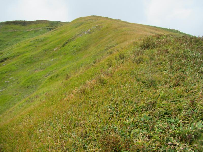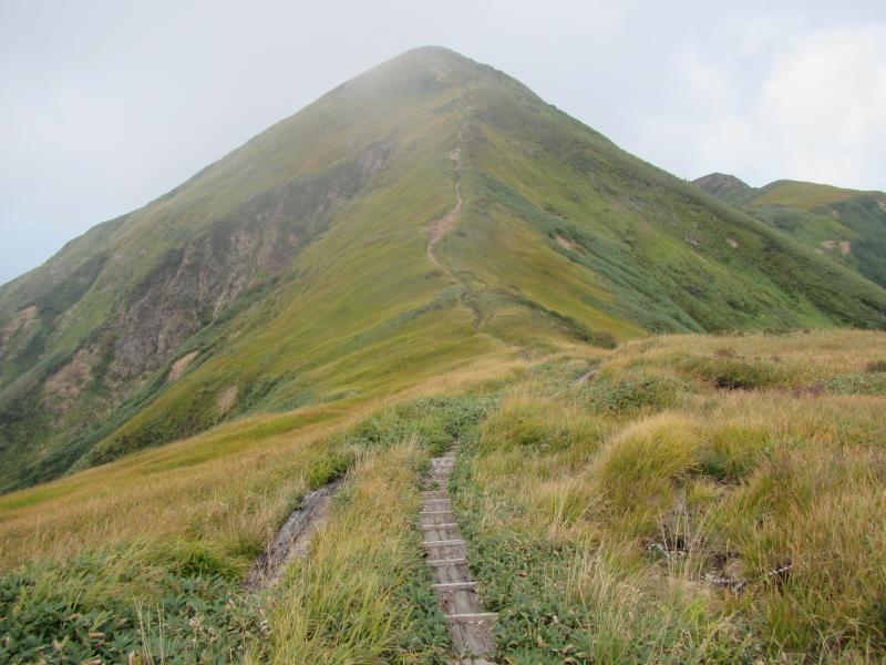 雄大な展望を楽しみながら、優しい草原をゆっくりと登り詰めると、割引岳へ向かう登山道に飛び出します。そこからは一登りで山頂へ。