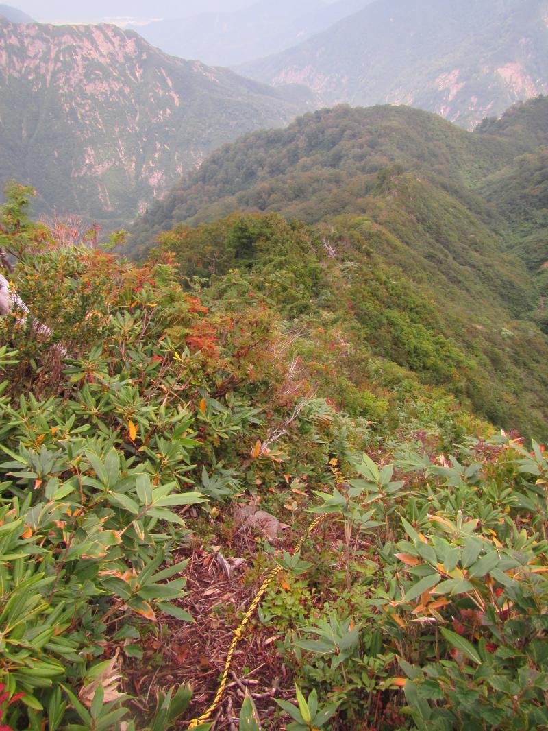 ロープがあるとはいえ、垂直の壁の下の様子は分からず、安易な垂直懸垂下降はやはり危険。結局下降は断念し、ヤブのなかから“超絶大スラブ帯”を見下ろすのが精一杯でした。