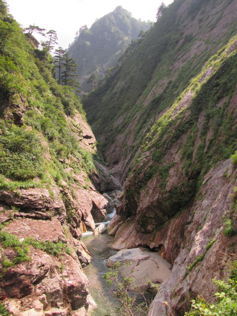 しかし今回は素直にトレッキングコースをアプローチとして利用します。道に散らばった沢山の栗を貪る猿の群れに“ごめんなさい”をしながら、ズンズンと水平歩道を突き進みます。新道入口を過ぎると両岸は岩壁が屹立するようになり、垂直ド迫力に水を落とす風鼻滝に目を奪われます。やがて小1時間ほどで人工の構造物“取水口”=小さなダム!?へ。