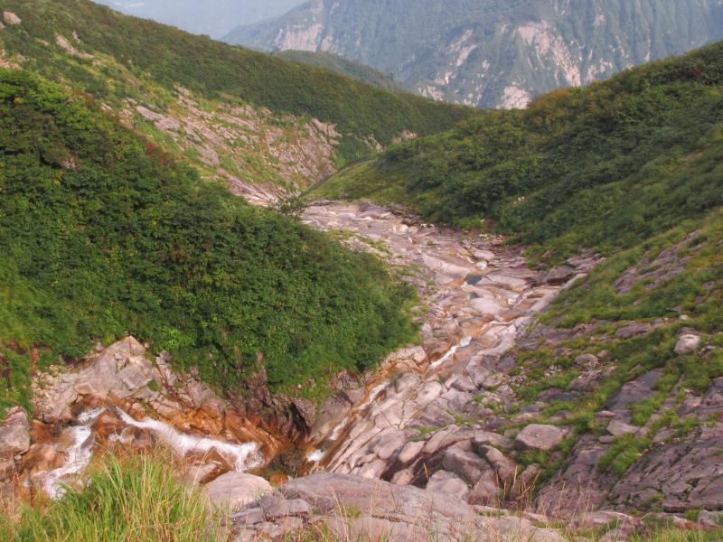 とりあえず沢に降りてみることにし、急峻な草地のなか、笹や灌木をつかみながらジグザグに下降していきます。沢に降り立つと今までの急登が嘘のような爽快さ溢れる別天地。極上のナメ床のなかで装備を換装し、ミニゴルジュを少し下降。さらに核心部である“超絶大スラブ帯”への下降を試みます。