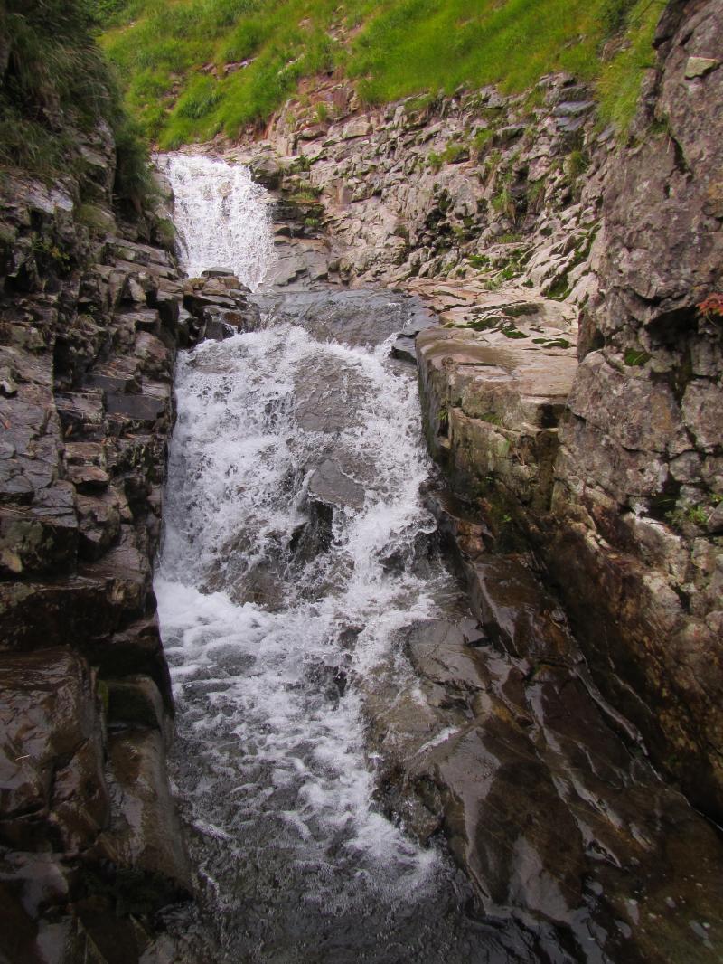 平時は水路に水はなく、鎖につかまって5mほど下り、再び鎖を頼りにダムに這い上がって対岸に渡るのが一般的のようですが、この日は奔流が鎖を覆い尽くしている状態(因みにもっと昔は針金だったようです)。これは連日の大雨による影響だったのでしょうか。