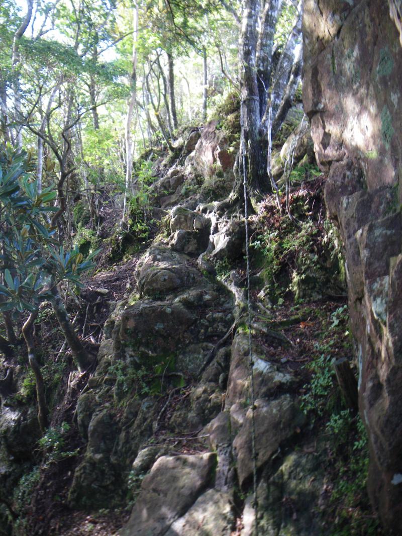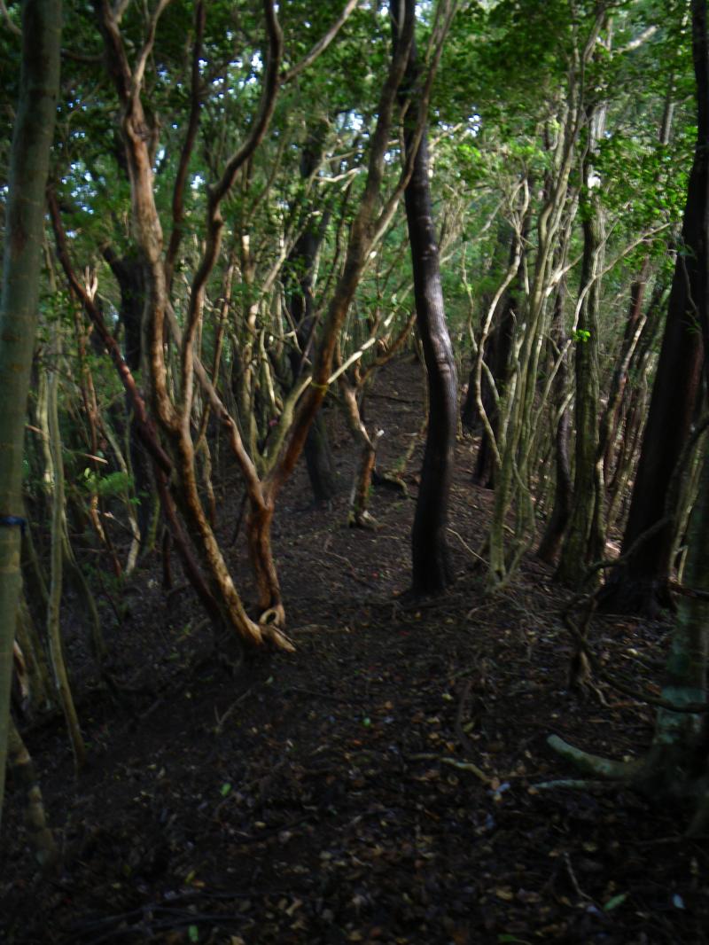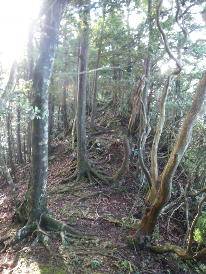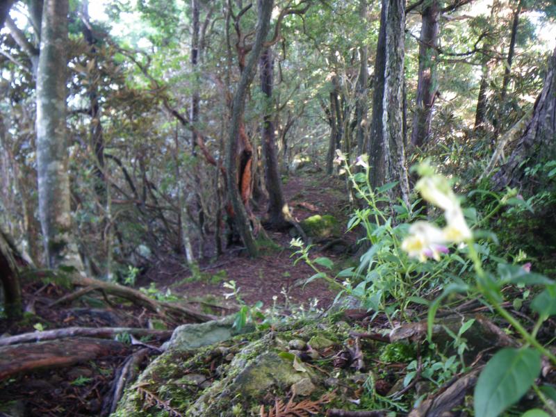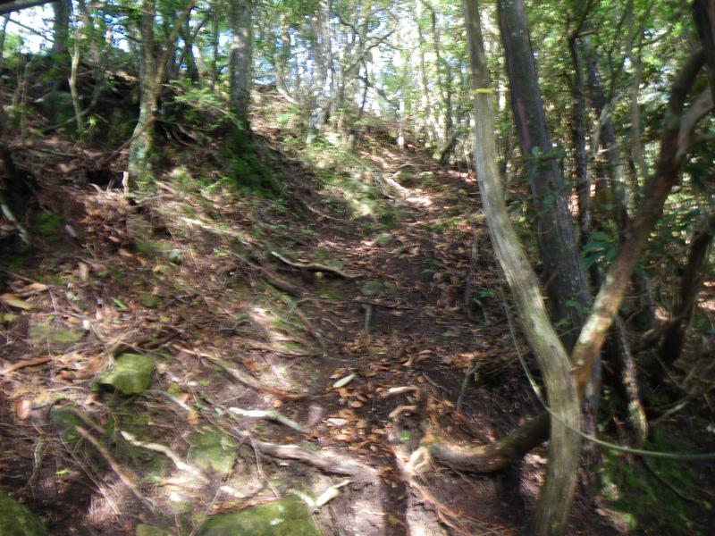 ⑤尾根からは一転、細いヤセ尾根になり、東峰への登りと頂上への登りが急です