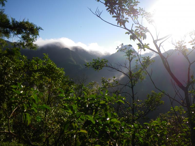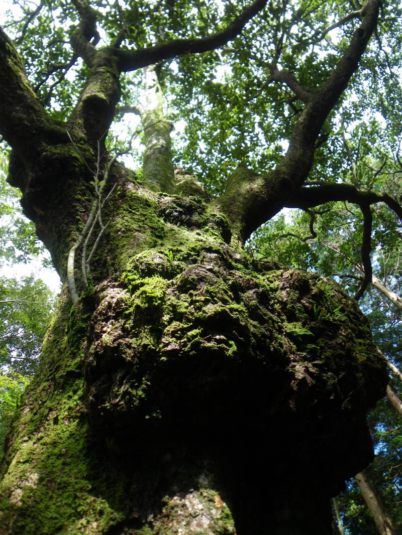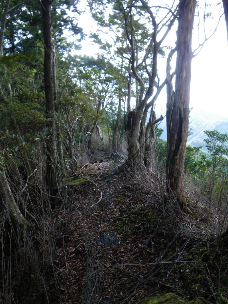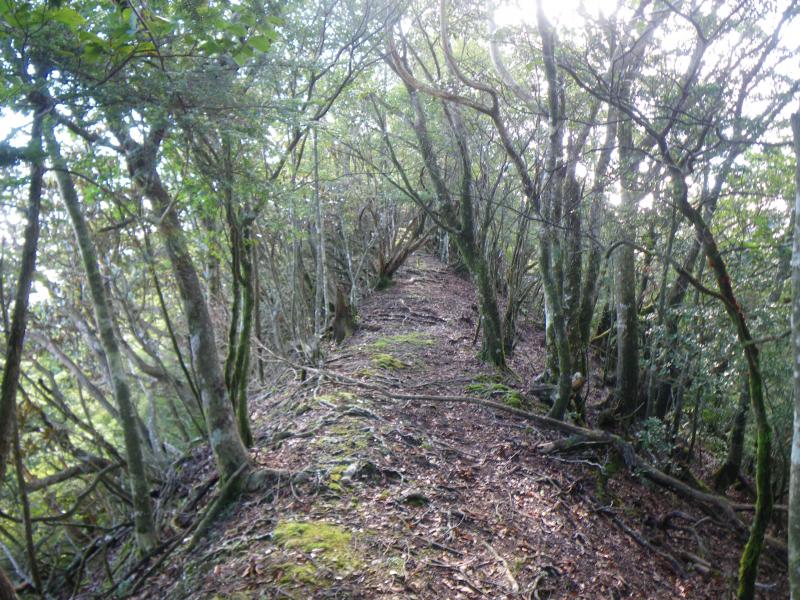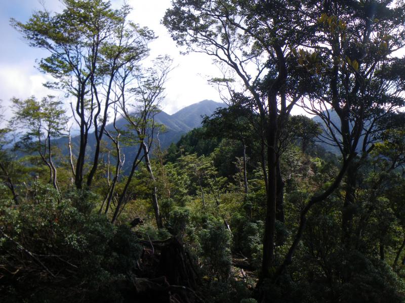 隣同士の山を今回は周回してきましたが、この間は地形図にも載っていない登山道があります。とはいうものの迷いそうな所でマーキングもしっかりしていることからもし山と高原地図があれば破線ルートくらいでしょうか。距離は長く、ほぼ樹林帯で現在地把握がむずかしい登山道です。細い稜線が大半で何回もアップダウンがあり、残置ロープも一部設置されています。あまり人が行きそうにないですが、静かで大きな大木があり豊かな自然を感じました。また大峰山系と違い、鹿ではなく猿によく出くわしましたが、年間降水量が4000mmで日光が降り注ぐこの山域では冬でも緑の葉をつける照葉樹林が多いので、エサにも困らないようです。