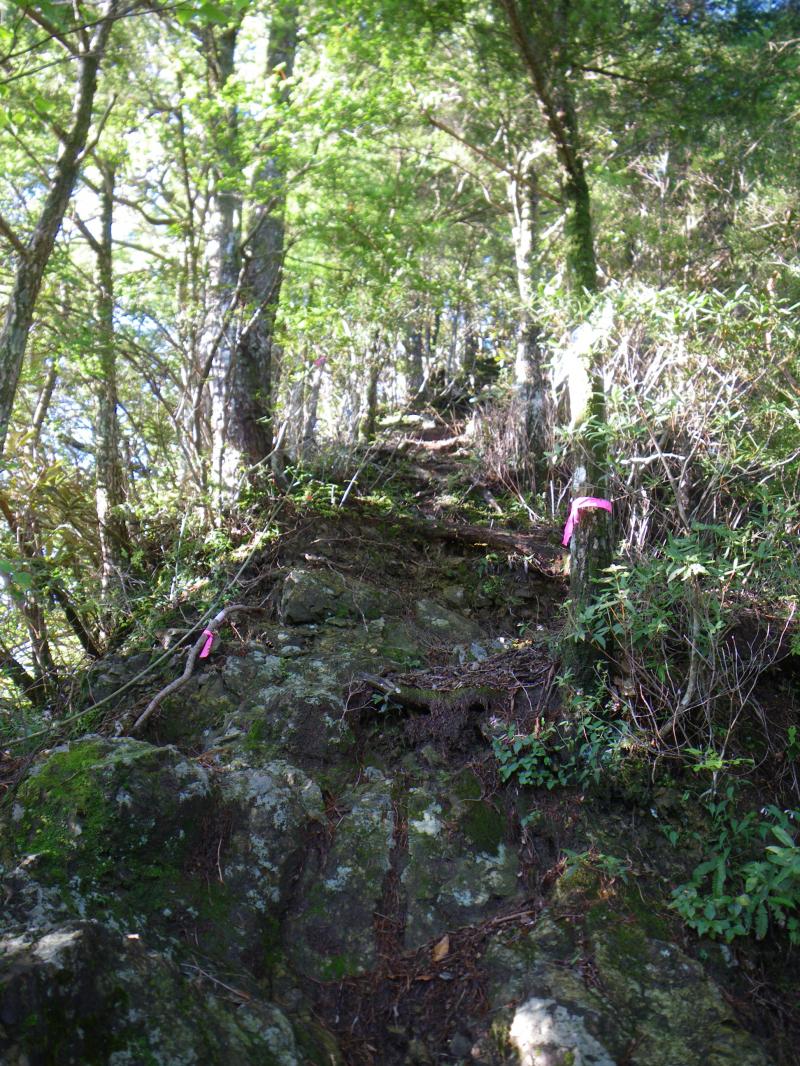 ⑧886mから先はヤセ尾根になり残置ロープ設置のギャップがあり、かなり急な下り・登りです