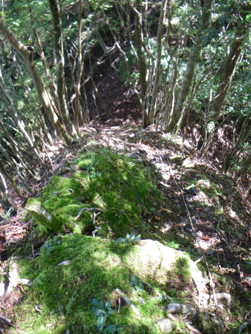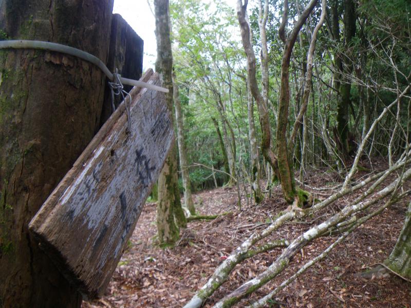 ⑪一の峰付近からと一ノ峰と二の峰鞍部から弘法杉への登山道がありますが、こちらは一ノ峰付近に標識が地面近くにありますが、見落としそうです