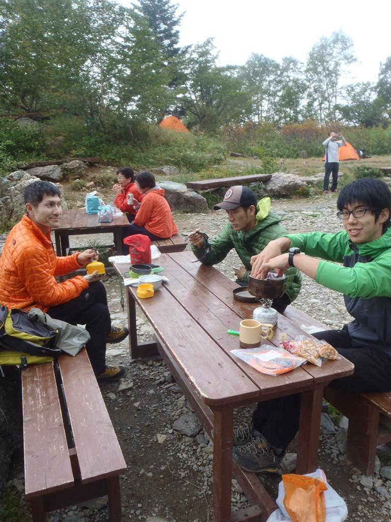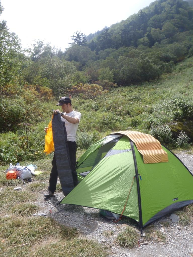 白根御池でテントを立てて、クライミング道具だけ背負って下見に行きました。なにせ翌日は真っ暗な中アプローチしなければならないので、下見なしでは迷うこと必至。
