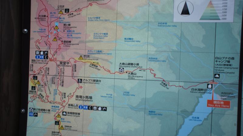 - 大白川登山口(125分)⇒大蔵山山頂(30分)⇒大白川登山口から5キロ地点(30分)⇒カンクラ雪渓(45分)⇒室堂(35分)⇒御前峰(55分)⇒大汝峰(55分)⇒室堂ターミナル(145分)⇒大白川登山口