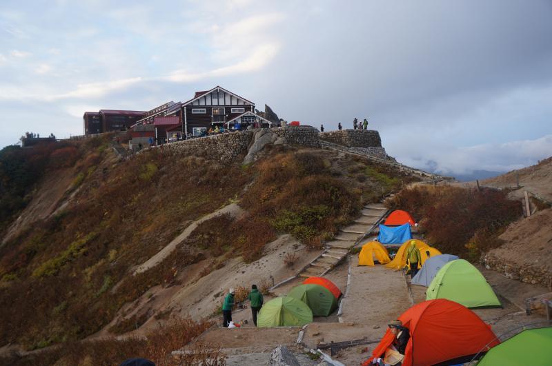 - 1日目:中房温泉(35分)第一ベンチ(25)第二ベンチ(30)第三ベンチ(35)富士見ベンチ(30)合戦小屋(70)燕山荘(30)燕岳(25)燕山荘テント場