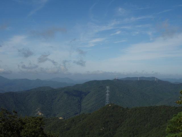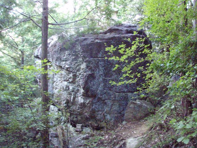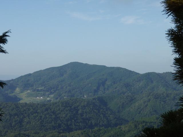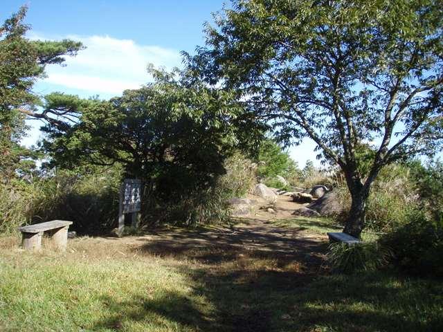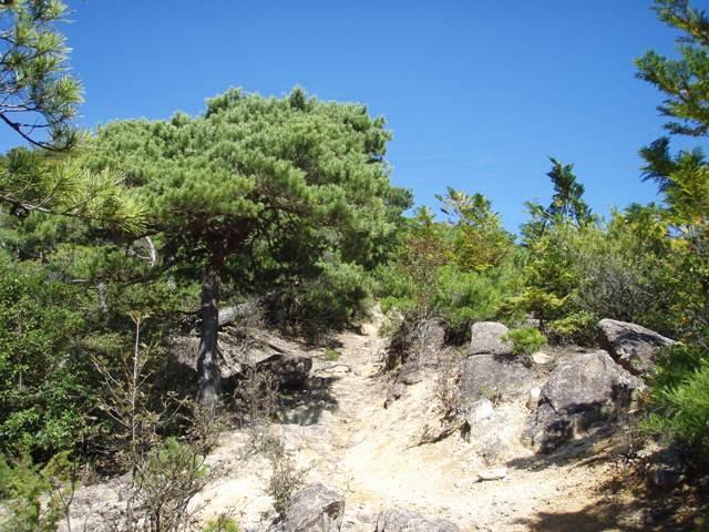 なだらかな勾配の道をじわじわ登って行くと、炭焼窒跡、六地蔵が現れ、坂を上りきった所で剣尾山の山頂に到着。三角点なし、展望あり。気温23度。登山道両側にある大岩からは東と西の展望が開けていました。