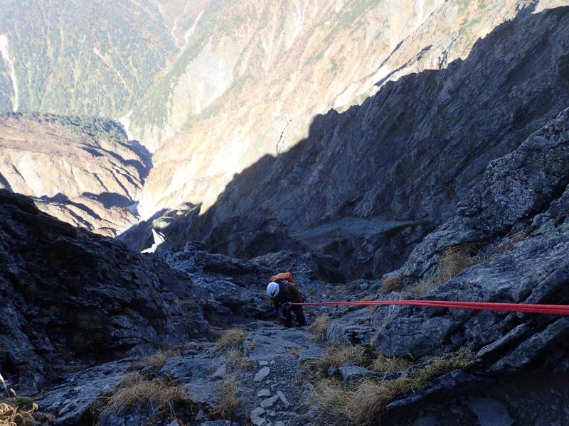 滝谷ドームを巻いた鎖の直下から右下に下りていくとT1の下降ポイントにつきます。よく登られているルートだけあって下降支点はしっかりしています。懸垂下降はきっちり25mなのでロープ1本で降りられます。降りた後は左上すると中央稜の取りつきに来られます。