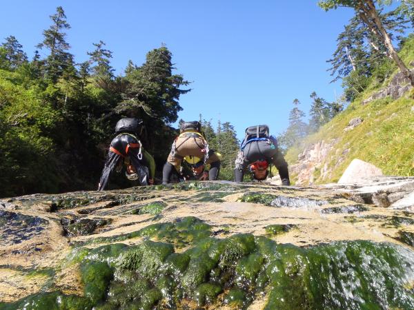ここから先は名前のある滝はないものの、美瀑とナメ床が交互に現れ、その美しさに触れるたびに水の中に足が止まります。滝は落差があるものの、直登可能なものが多く、快適に登っていくことができます。