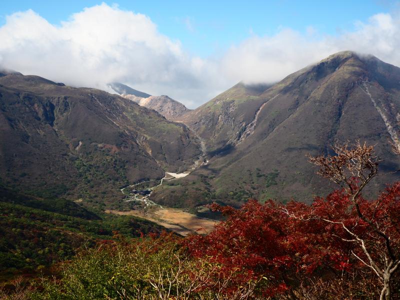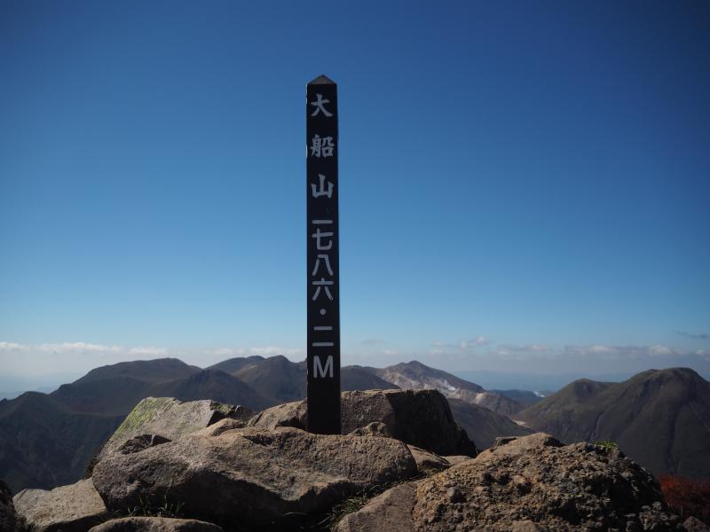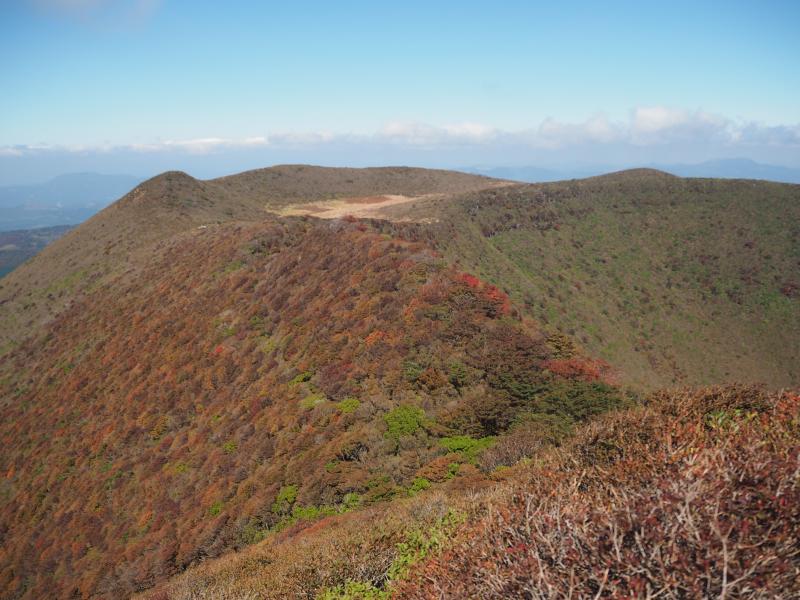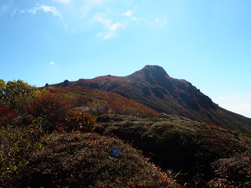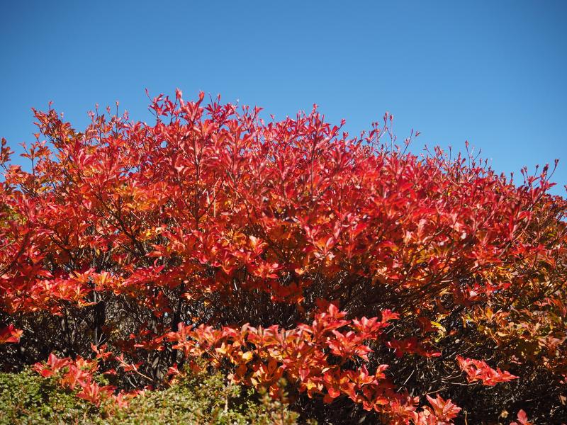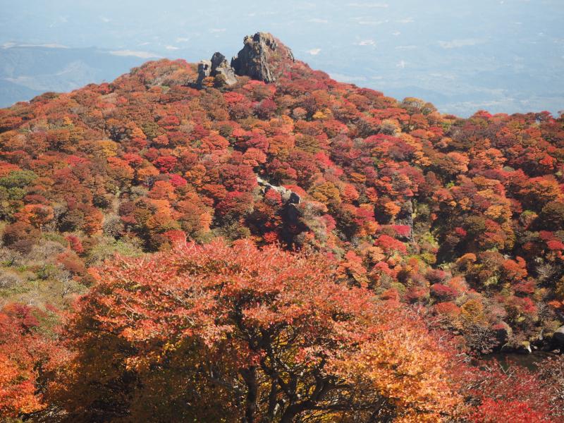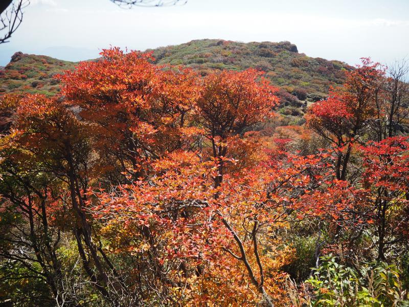 天気も良くこんなにどんぴしゃな時に大船山に登ったのは初めて。例年より一週間ほど早いんだとか。いつも遅すぎて茶色になってしまってたので、、朝のうちモヤがかかっていた山頂も着くころにはピーカン!青空に紅葉の赤が映えます。山頂からの展望も360度バッチリ。三俣山も赤く染まっています。さすがに平日でも今日は大賑わい。こんなにたくさん人がいる大船山の山頂も初めてでした(笑)